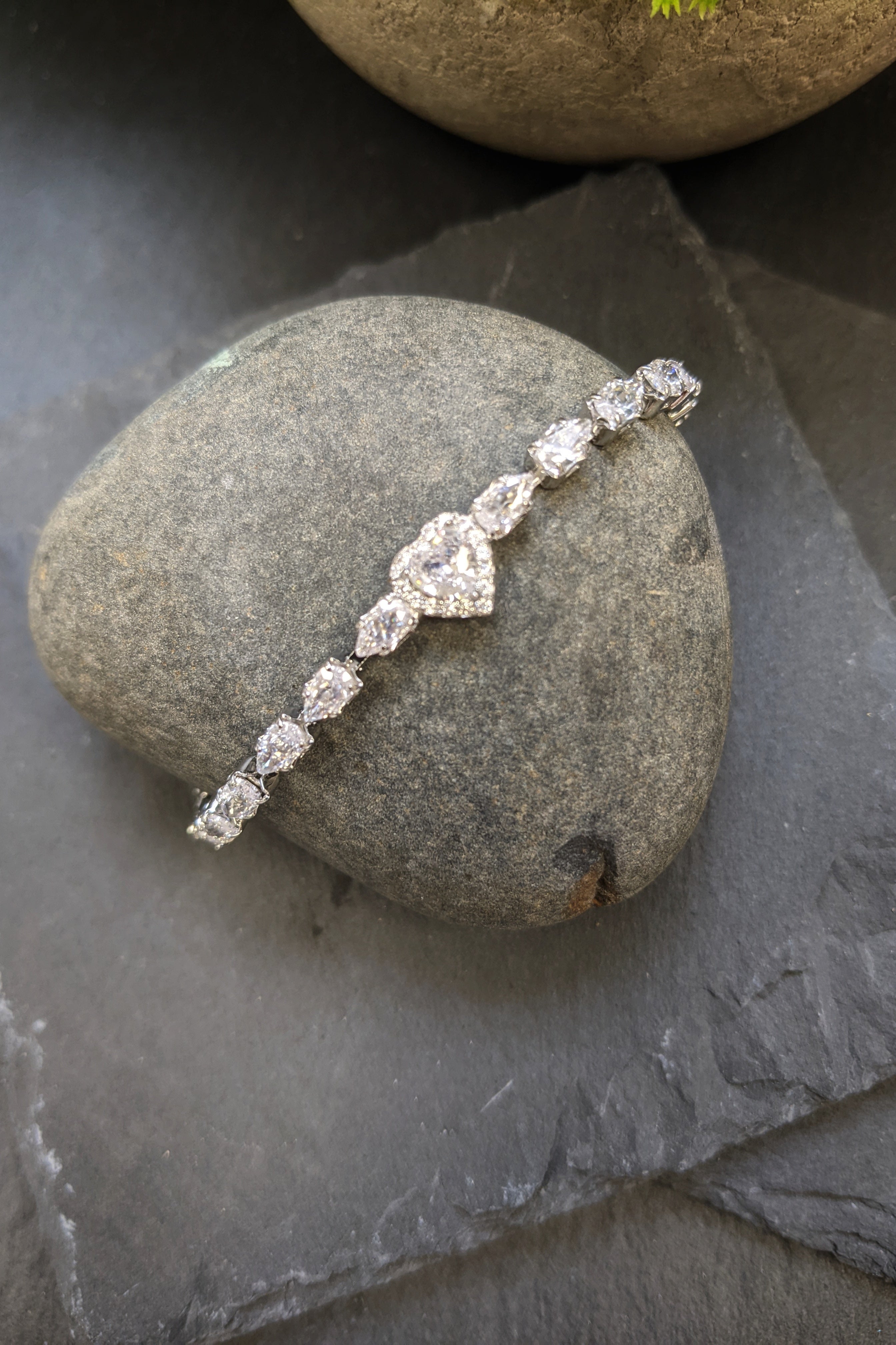 Add a touch of glamour to your wrist with this stunning bracelet. It features a mix of different cut diamantes, and a beautiful larger heart gem, which will catch the light effortlessly. The adjustable fold over clasp fastening adds the perfect finishing touch. This elegant piece is perfect for elevating your everyday look or adding sparkle to that special occasion.