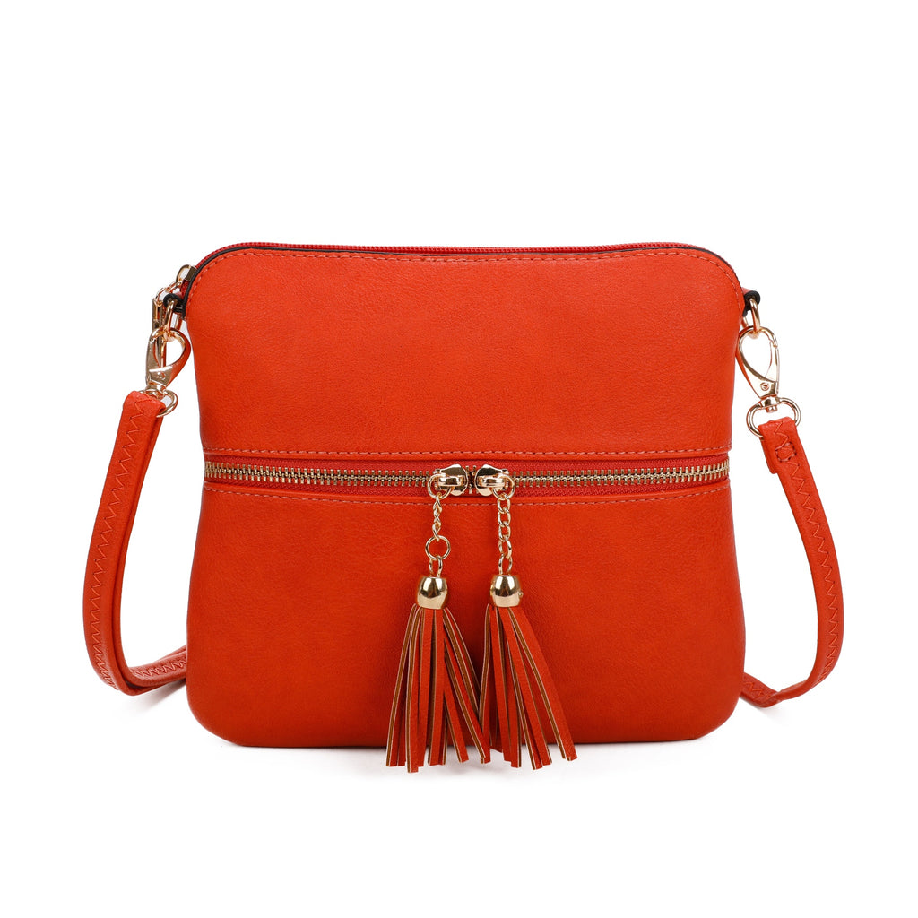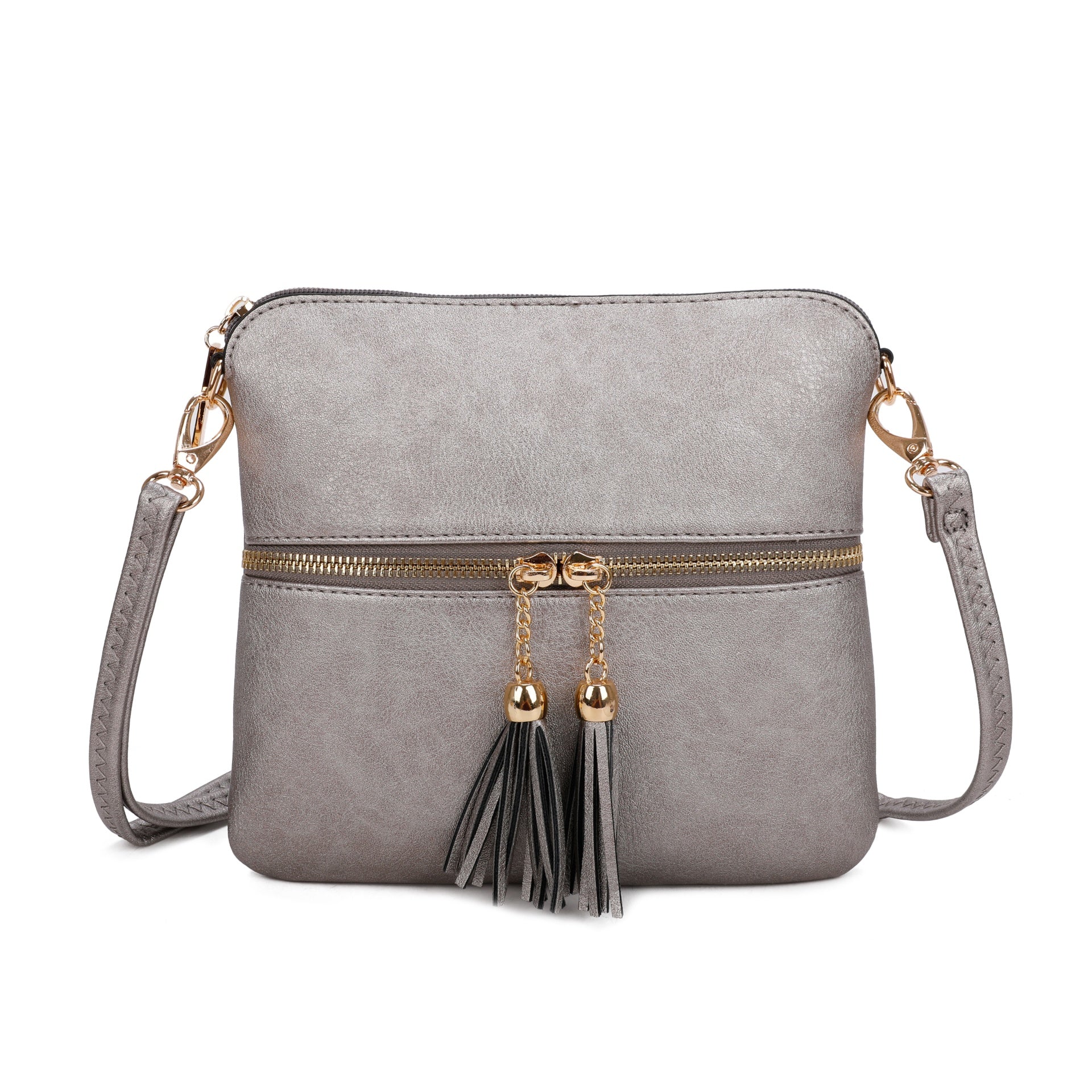 This simple and elegant crossbody bag features a detachable and adjustable crossbody strap, a top zip closure, fully lined interior with two internal slips and one zip pocket, and handy zipped pockets to the front and back. The gold tone zipped detailing and pretty tassels are the perfect finishing touch, making this stylish bag the ideal accessory for many occasions.