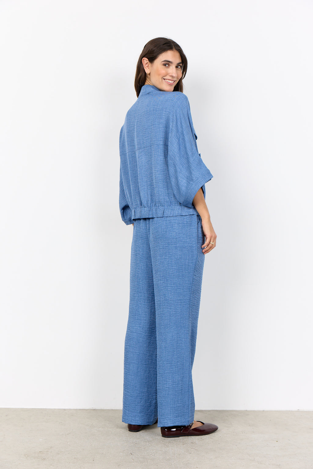 Elevate your everyday look with this effortlessly chic button up shacket from SoyaConcept. Crafted from 100% recycled polyester, this lightweight piece combines sustainability with modern design. The soft, textured fabric offers a relaxed drape creating an oversized statement style. Designed with two faux front pockets, elbow length sleeves with roll back detail, and a straight elasticated hemline. Team with our Charissa Ankle Grazers for the perfect combination of comfort and co-ordinated style.