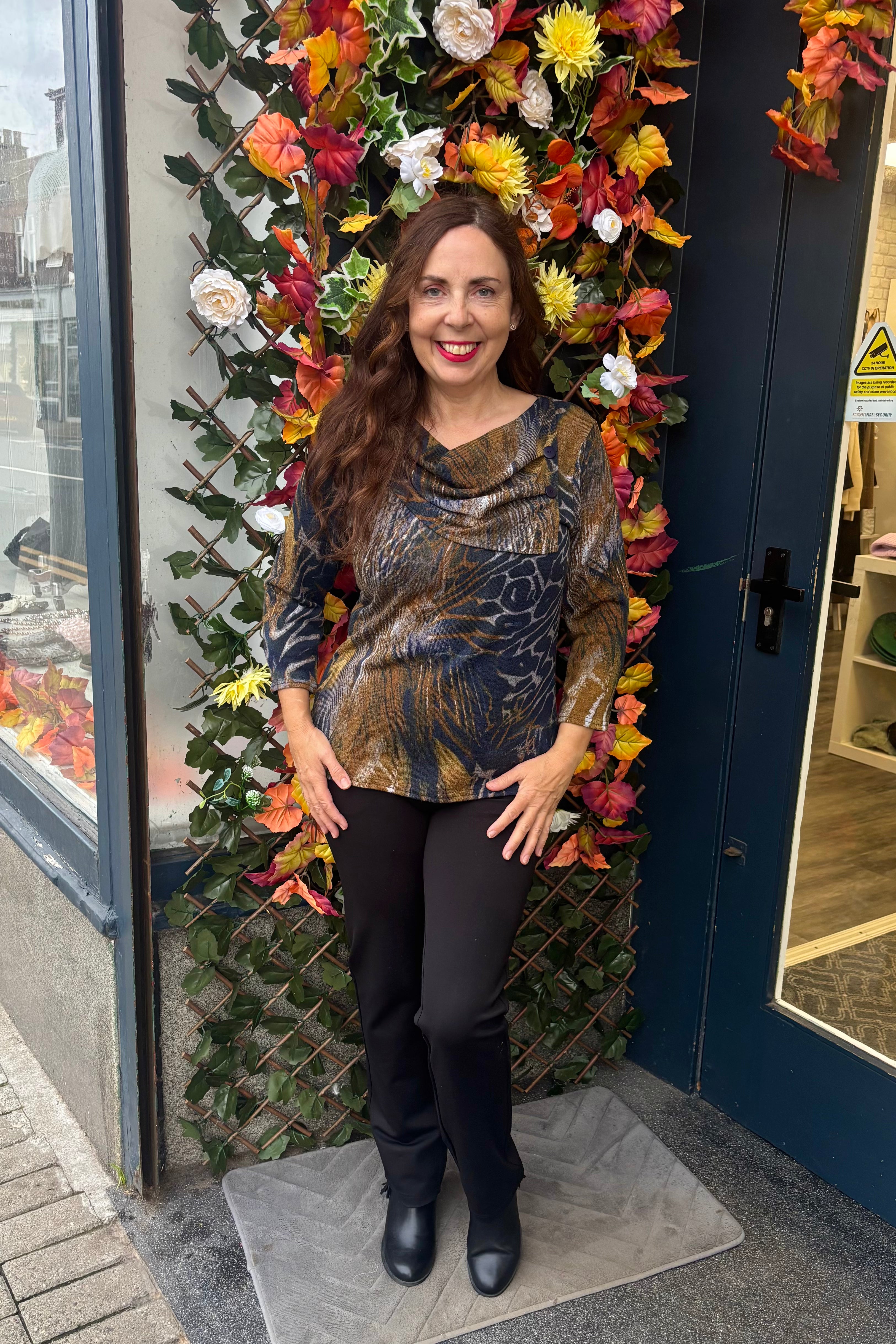 This beautiful top from Claudia C features a stunning animal print in a gorgeous colour mix. With a statement asymmetric cowl neck with side button detail, bracelet length sleeves, and a straight hemline. Team this fine knit with a pair of jeans and boots for a perfect everyday look.