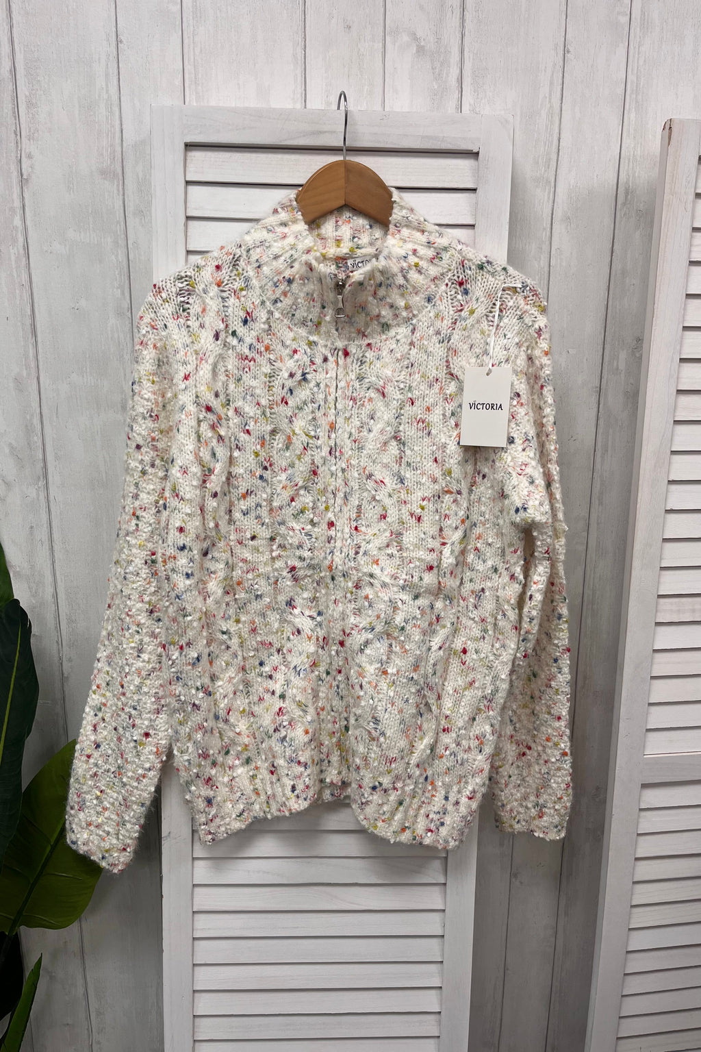 Our best selling Hilda cardigan is back WITH A TWIST! We are sure it will be just as popular this year. This stunning knit features an all over multicoloured flecked yarn with cable detail to the front, a turtle ribbed neckline, front zipped opening, full length dropped sleeves with ribbed cuffs and a straight ribbed hemline. Incredibly comfy and an easy wearing wardrobe staple.