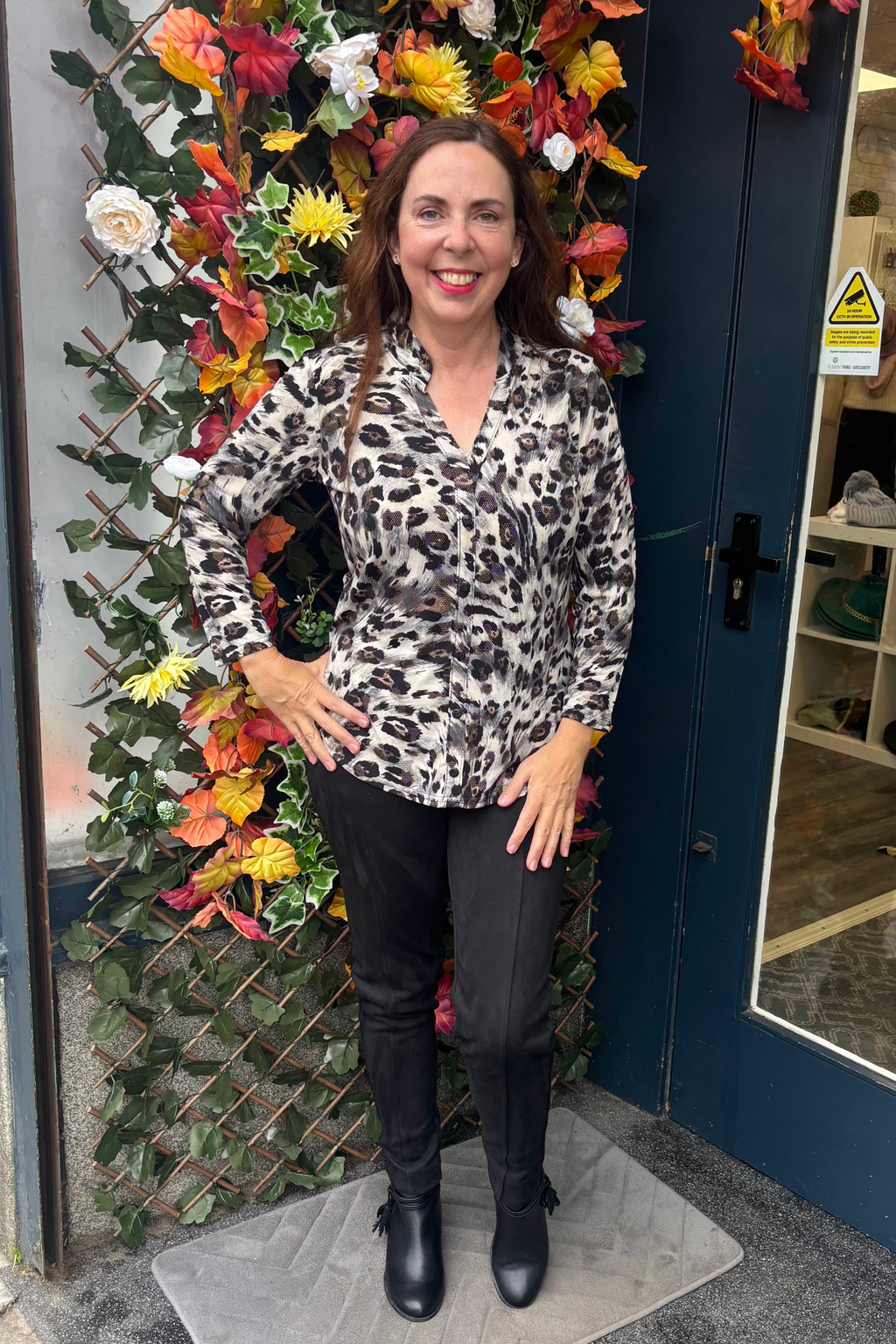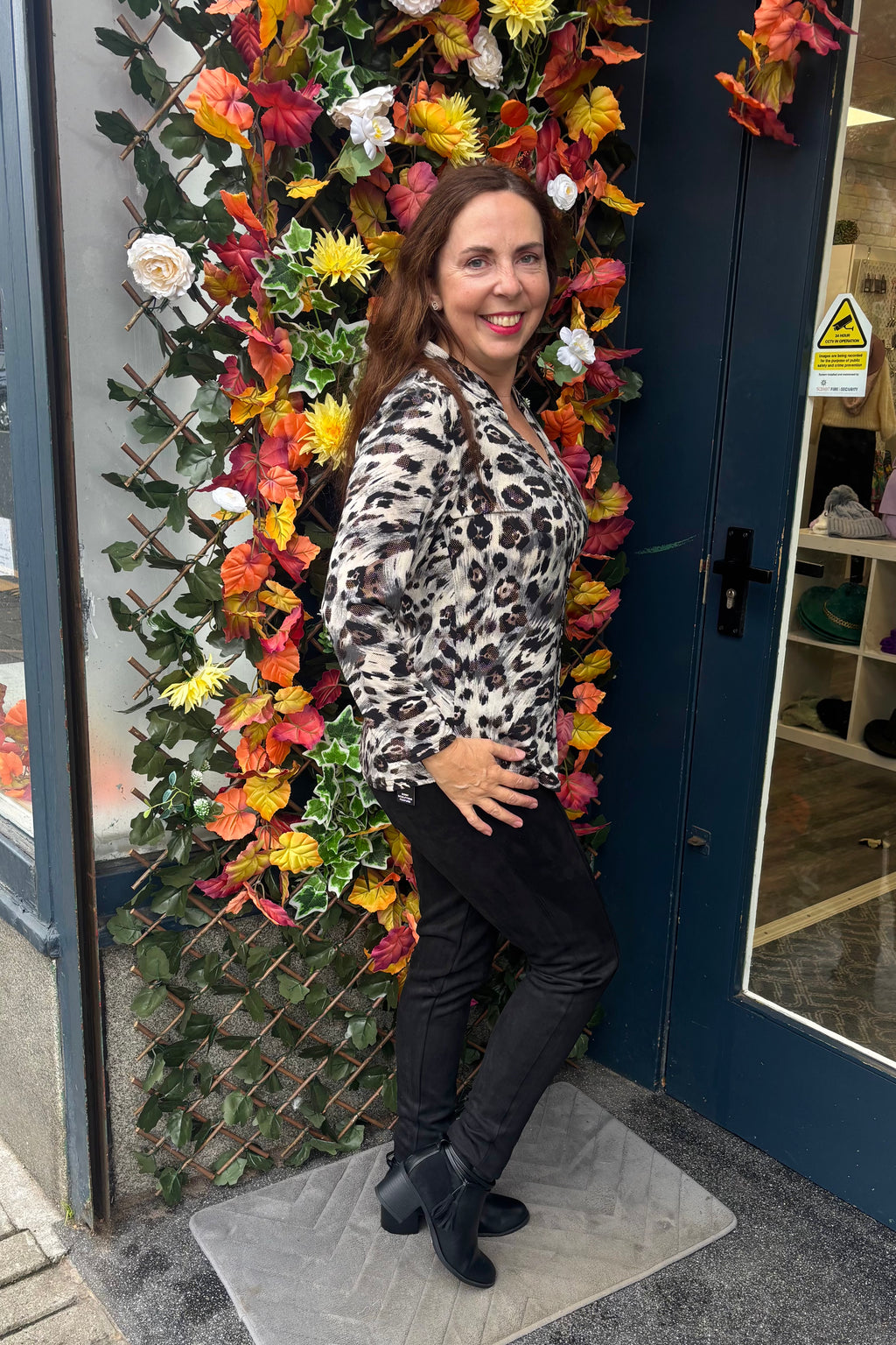 This stunning shirt style top from Claudia C features an all-over animal print with a subtle all over sparkle. With a notch style neckline, faux button detail to the front, and bracelet length sleeves. Style with your favourite jeans or trousers for an everyday look or team it with a pair of heels for a dressier occasion.