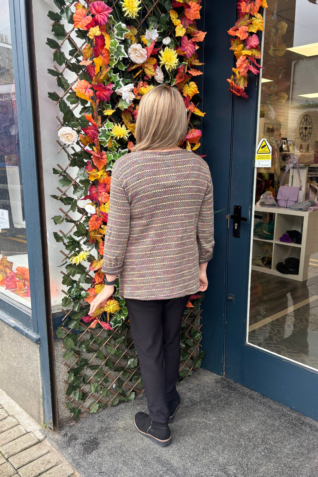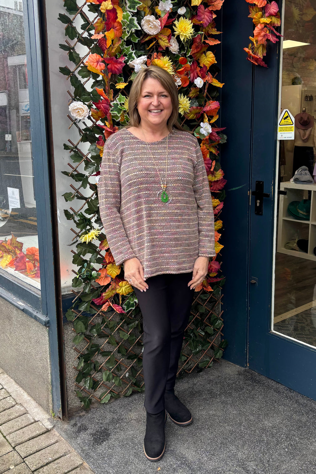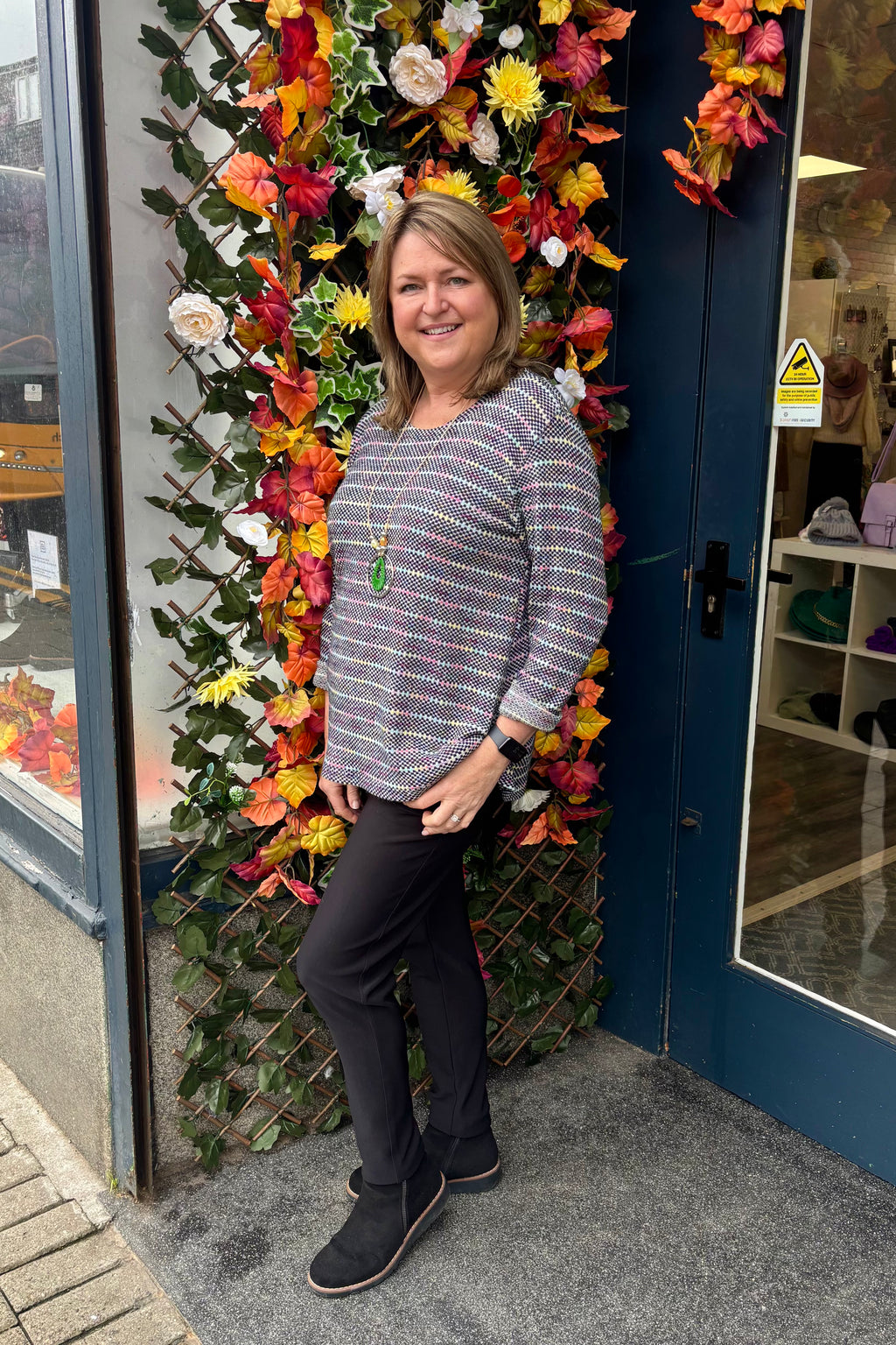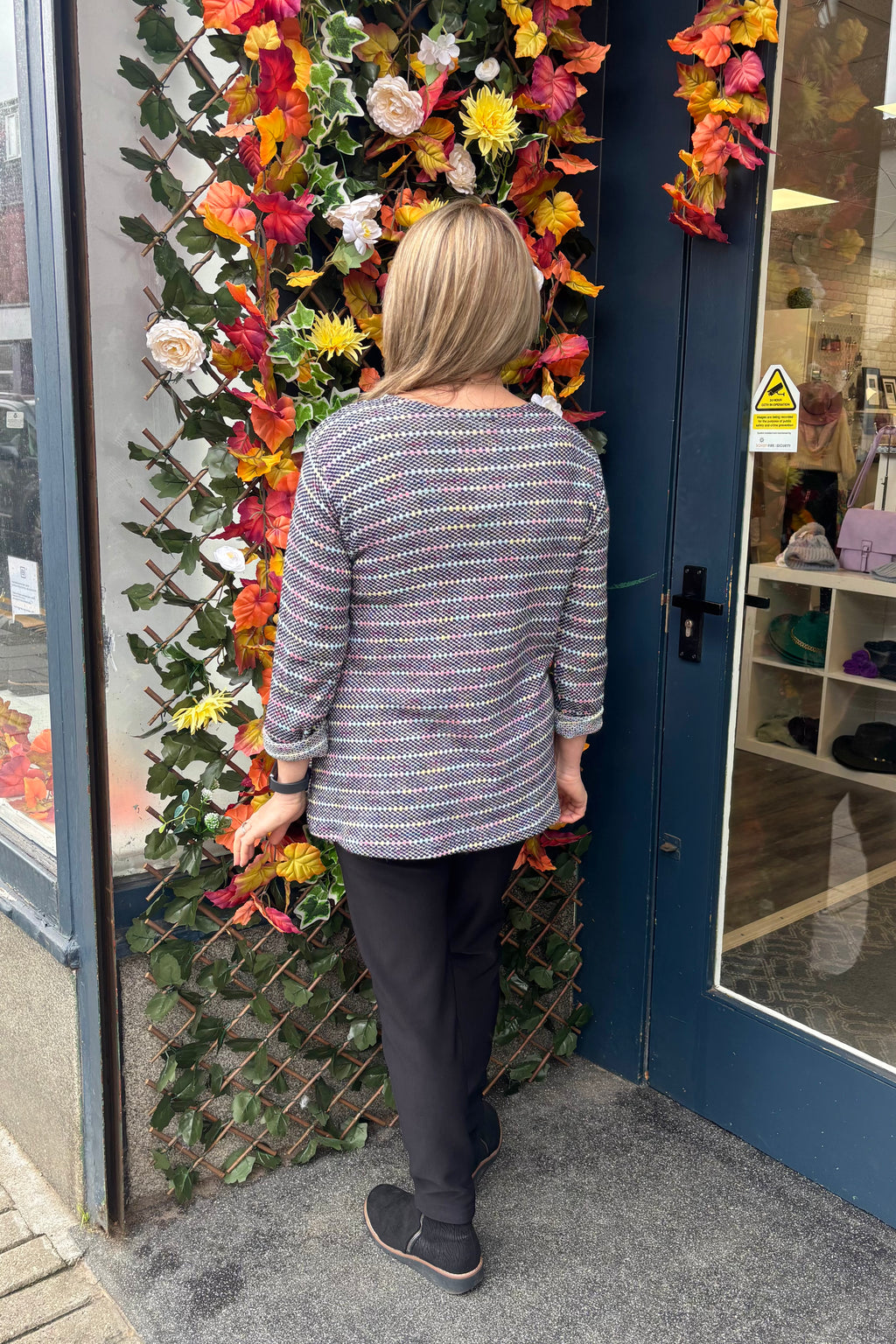 Bring a pop of colour to your look with our Louise necklace top. Designed with a flattering scoop neckline and long sleeves that can be rolled up for a laid-back look, this top is all about easy, everyday style. This knit top features a multicoloured stripe dash pattern and comes with a complementary necklace, the perfect finishing touch for an effortlessly put-together outfit.
