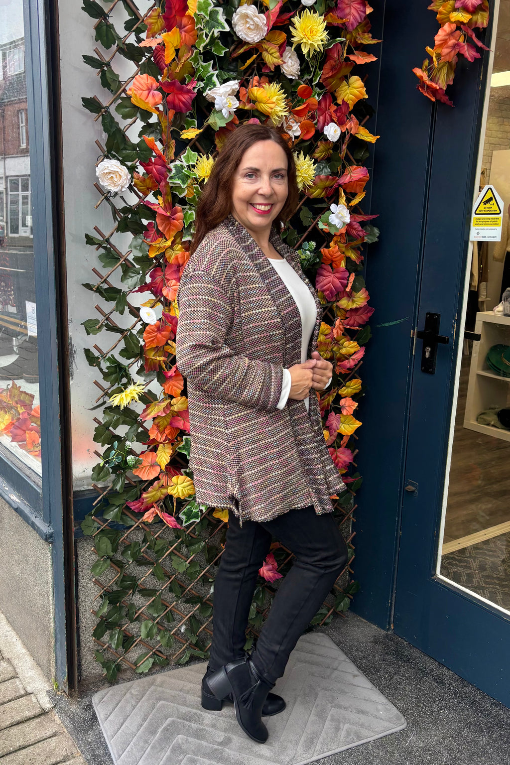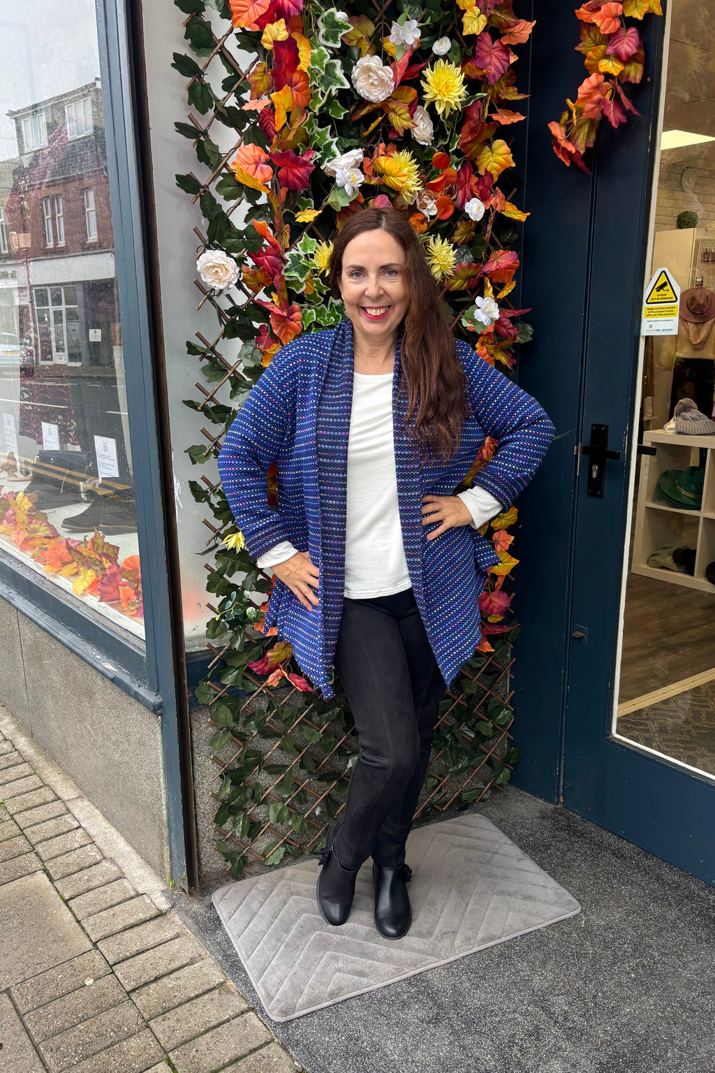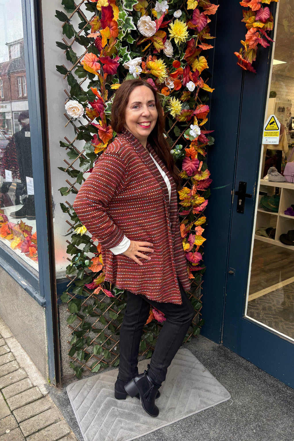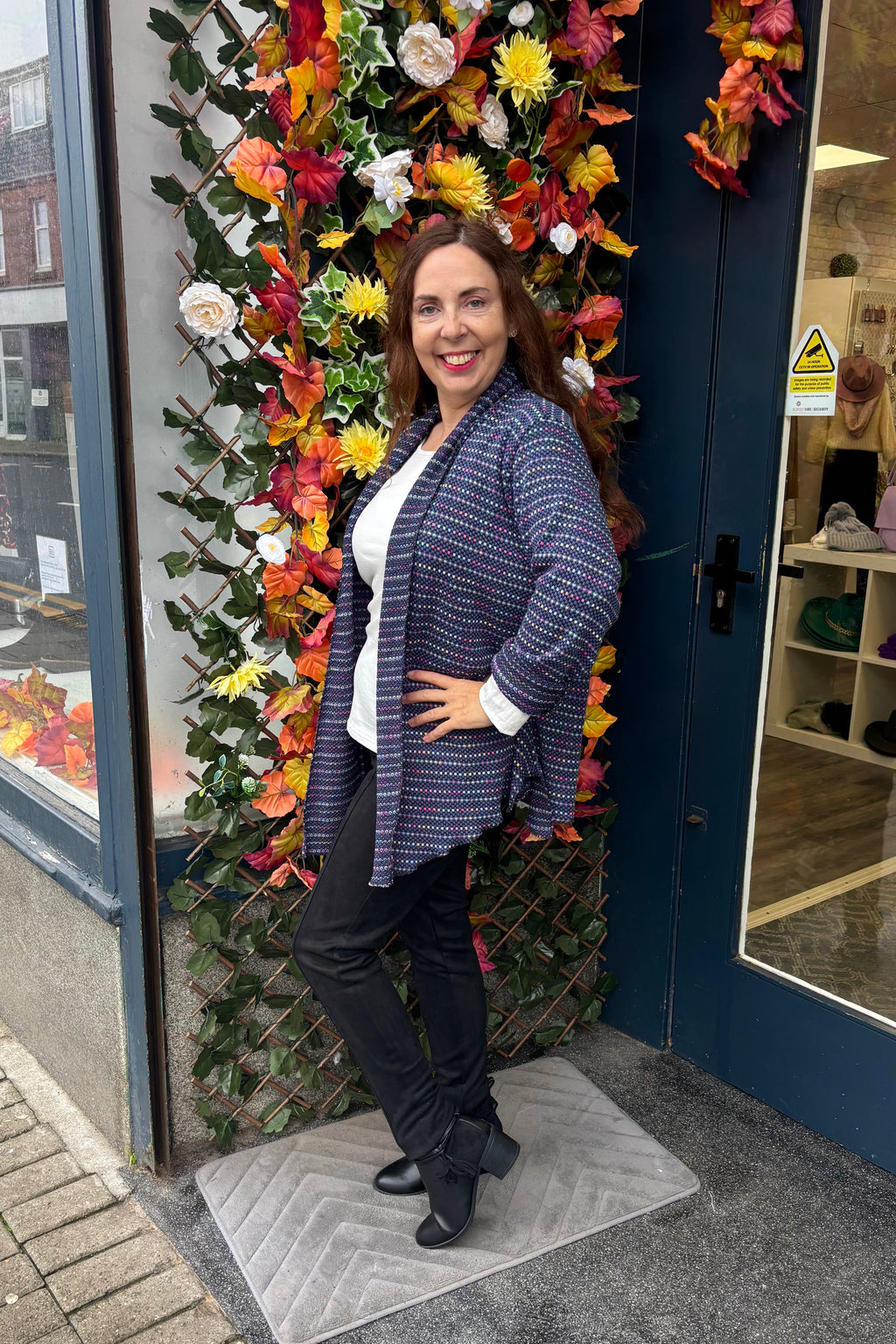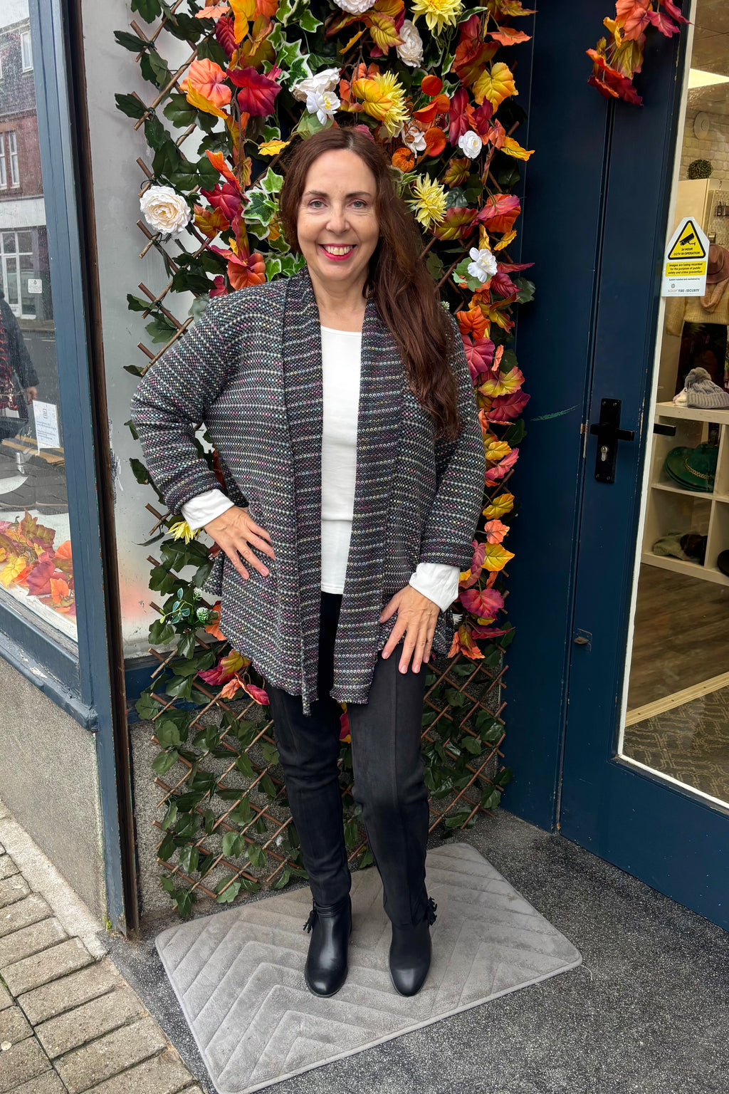 Wrap yourself in effortless style with our Thelma knit waterfall cardi, a perfect blend of comfort and chic. Featuring an open-front design, a multicoloured dash-stripe pattern for a pop of colour, and long sleeves. This piece is ideal for layering through the seasons.
