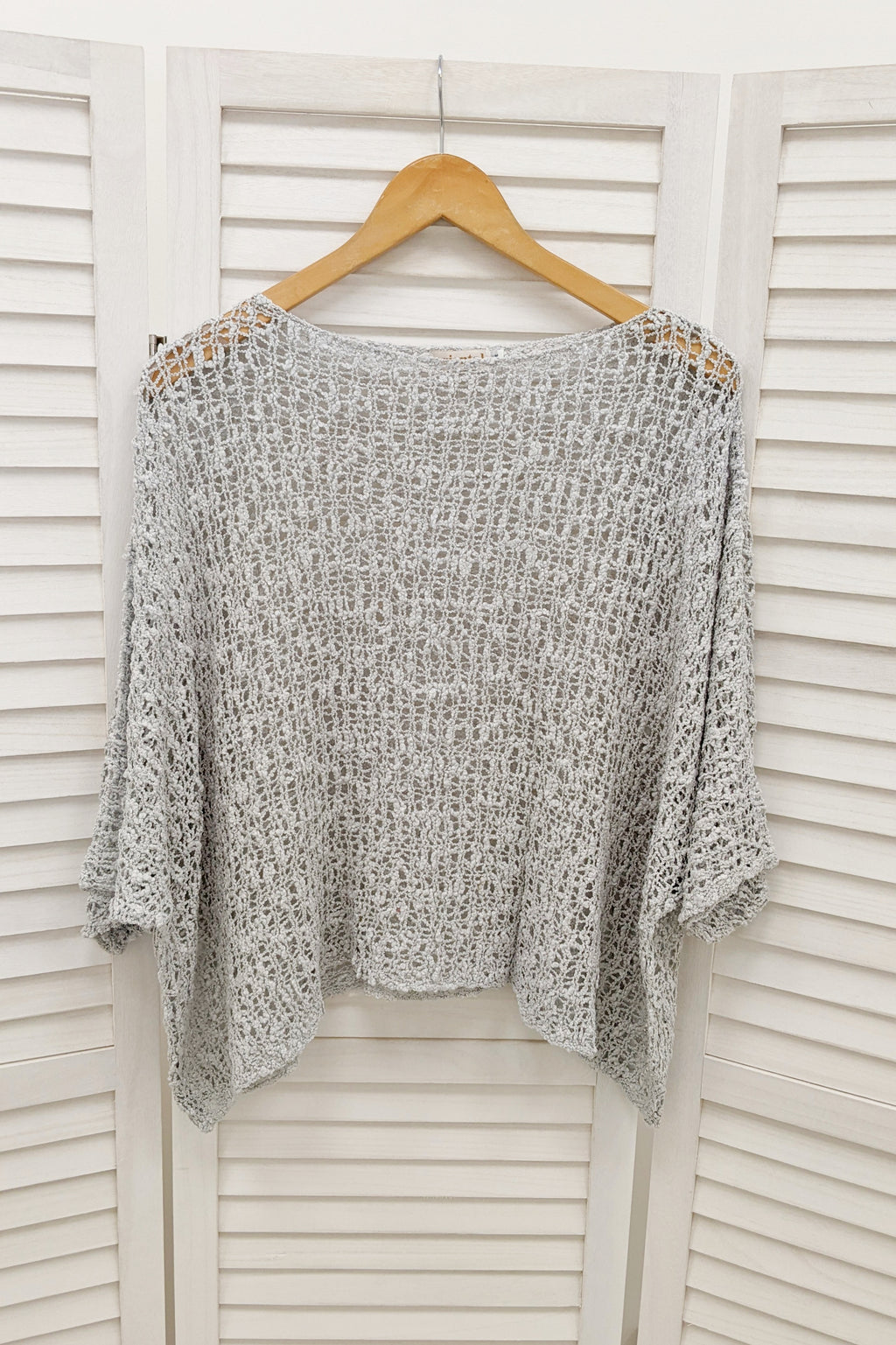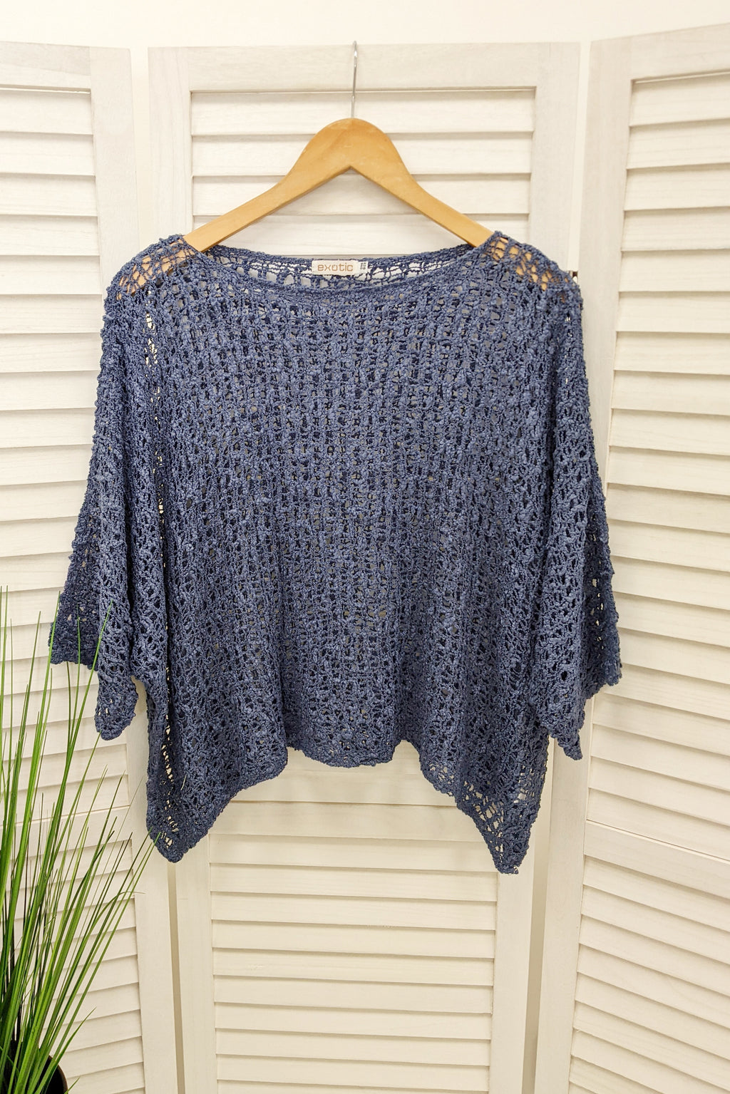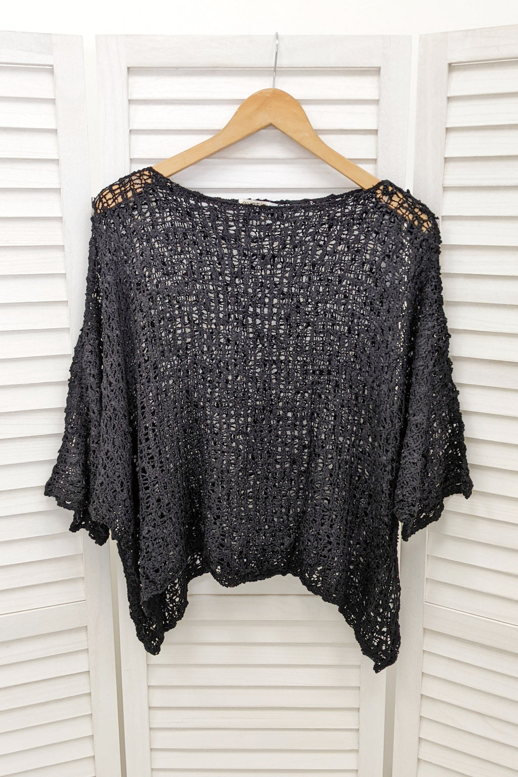 Popcorn knit boho style poncho top with 3/4 length batwing sleeves, a wide neckline and a curved hem. This fab poncho would look great over a vest or it can be dressed up over a jumpsuit or dress.