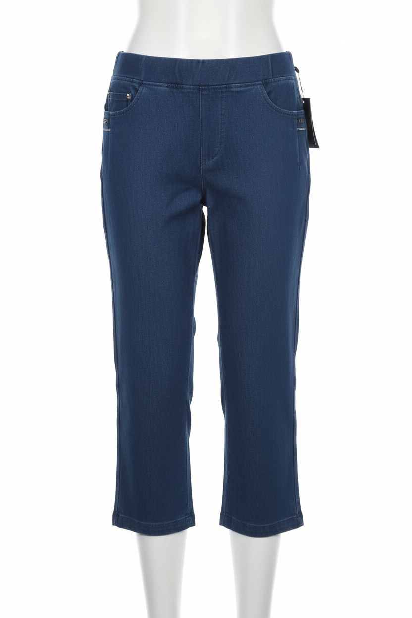 These pull-on denim crops by Claudia C feature a concealed, fully elasticated waistband, functioning front pockets with charm detail, and back pockets. The perfect alternative to jeans, lovely style in soft and super stretch fabric, designed for comfort allowing you to wear them all day long.
