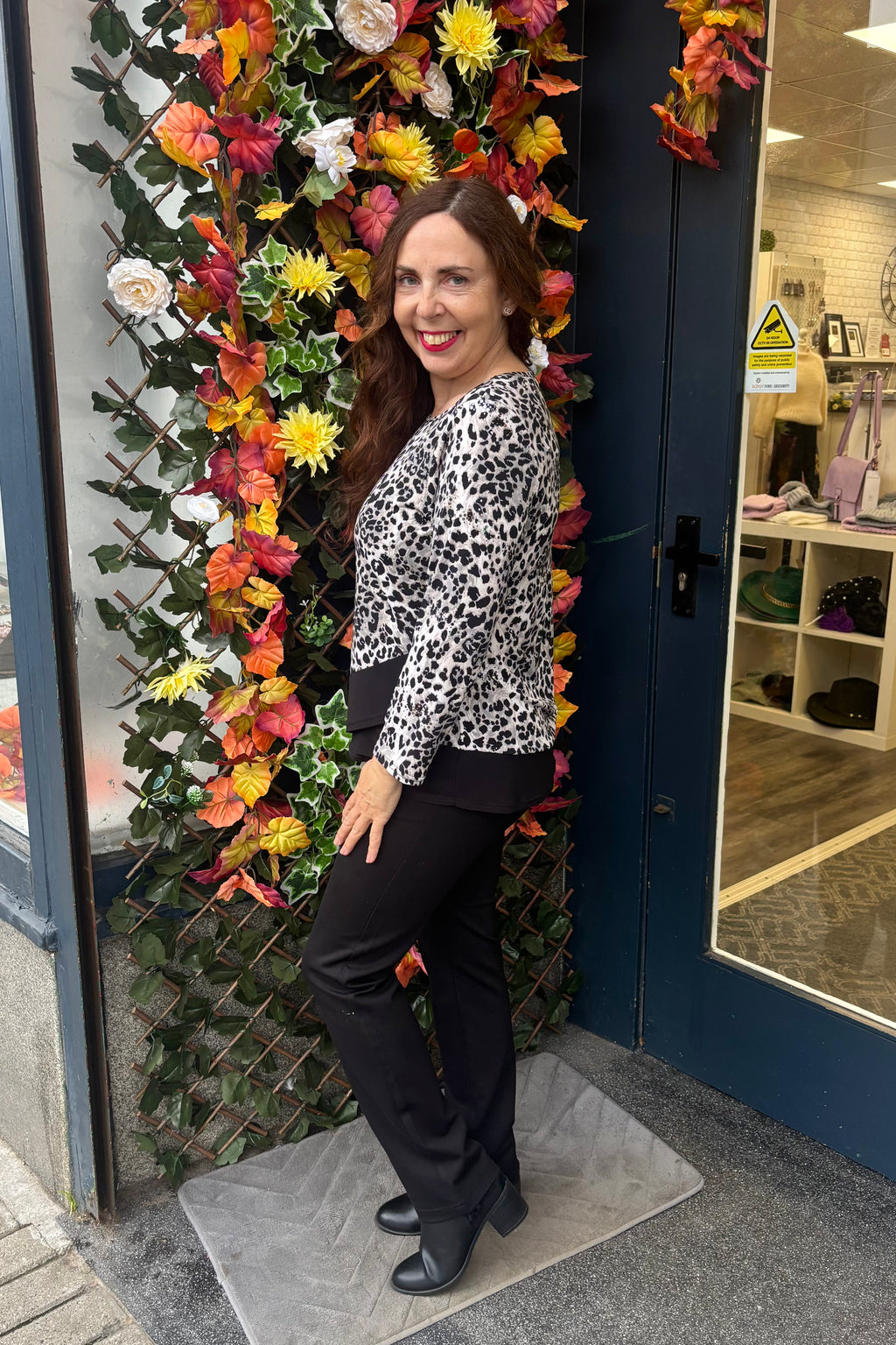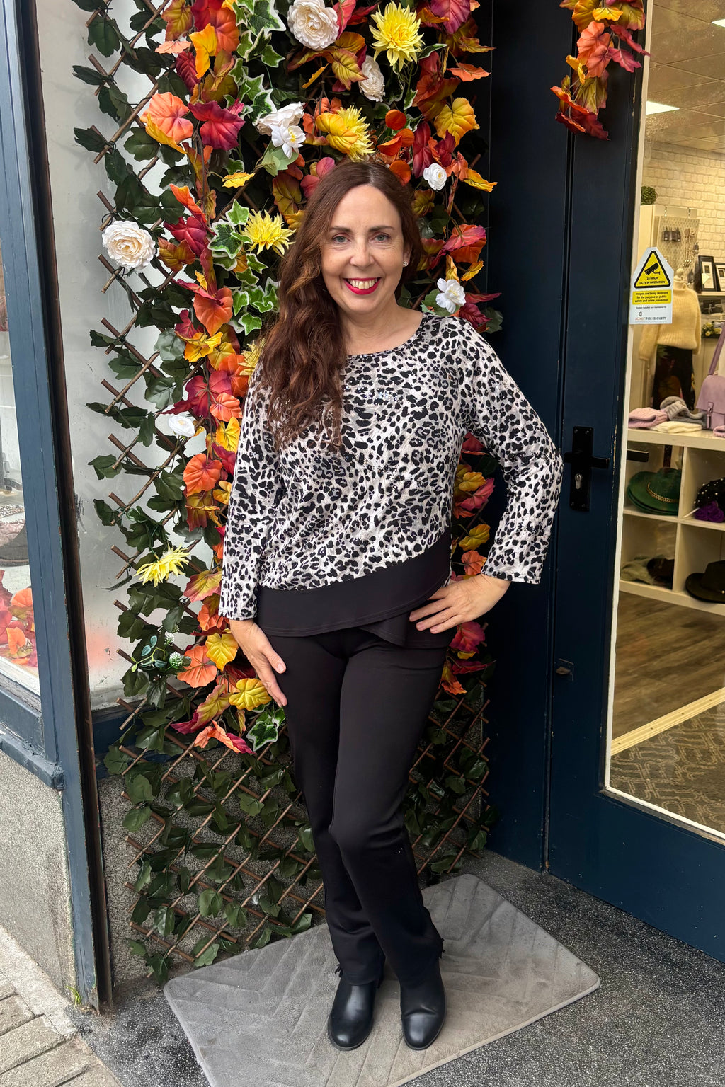 Turn heads with this striking top featuring a bold leopard - inspired print in rich vanilla/ash mix. Designed with subtle sparkle accents for an elegant touch, this top effortlessly combines comfort and style. Featuring a round neckline, and bracelet length sleeves. The soft stretch fabric ensures a flattering fit, while the asymmetric layered hemline adds a modern sophistication. Perfect for pairing with tailored trousers or jeans for an elevated day-to-night look.