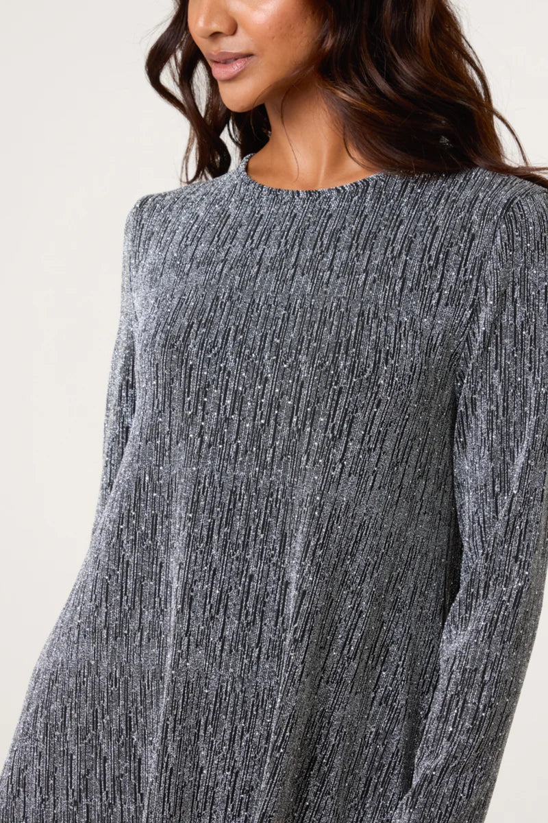 Make a dazzling statement in this shimmering silver lurex swing dress, adorned with scattered diamanté studs that catch the light from every angle. Designed with a flattering round neckline and full-length sleeves, it offers a perfect balance of glamour and comfort. The swing silhouette moves beautifully, making it ideal for parties, evening events, or festive occasions.
