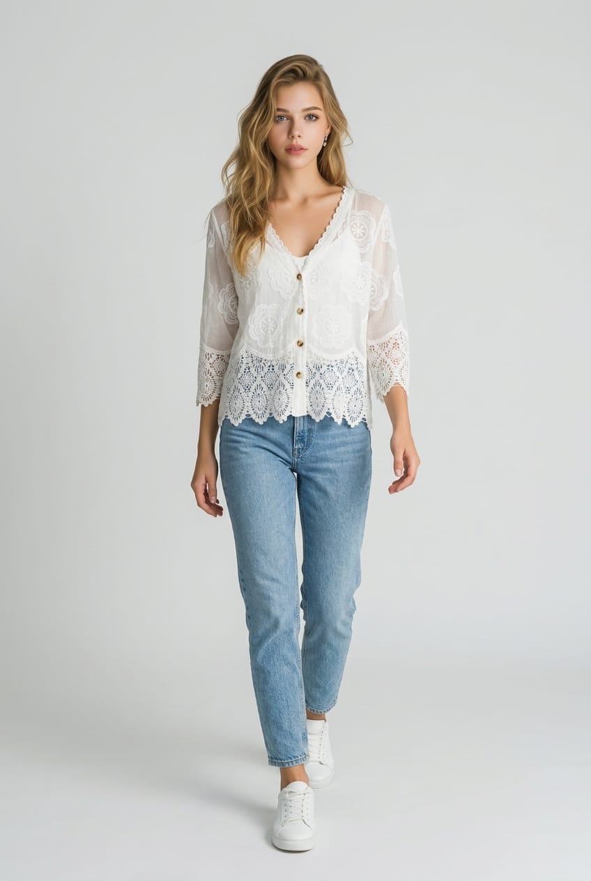 Lightweight and effortlessly stylish, this boho inspired cardi features delicate lace detailing and a relaxed, easy-to-layer fit. Designed with a flattering V-neck and button-front closure, it’s perfect for pairing with denim for a casual feminine look.