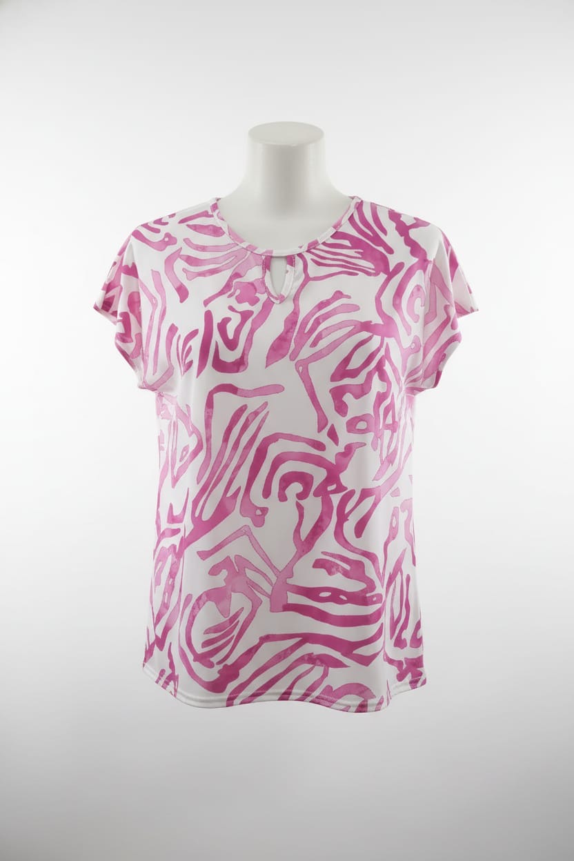 Bright and stylish, this Claudia C top features a bold pink abstract print on a white background. Designed with a round neckline, subtle keyhole detail and short sleeves. Lightweight and comfortable with a relaxed fit. Perfect for pairing with jeans or white trousers for an effortless look.