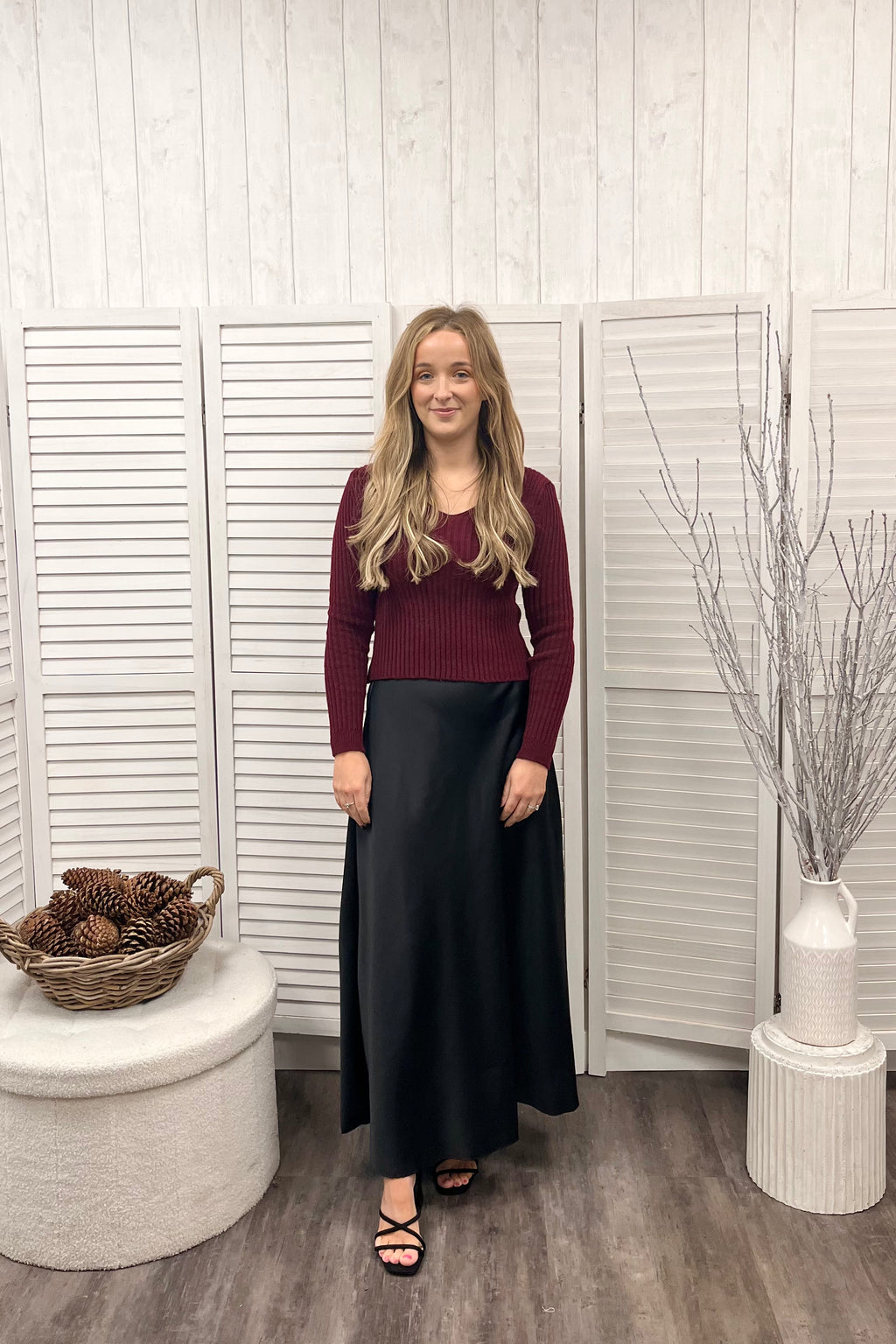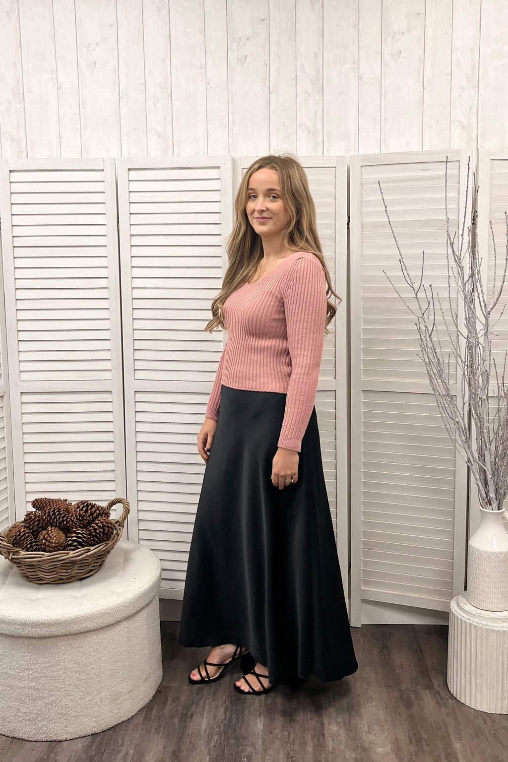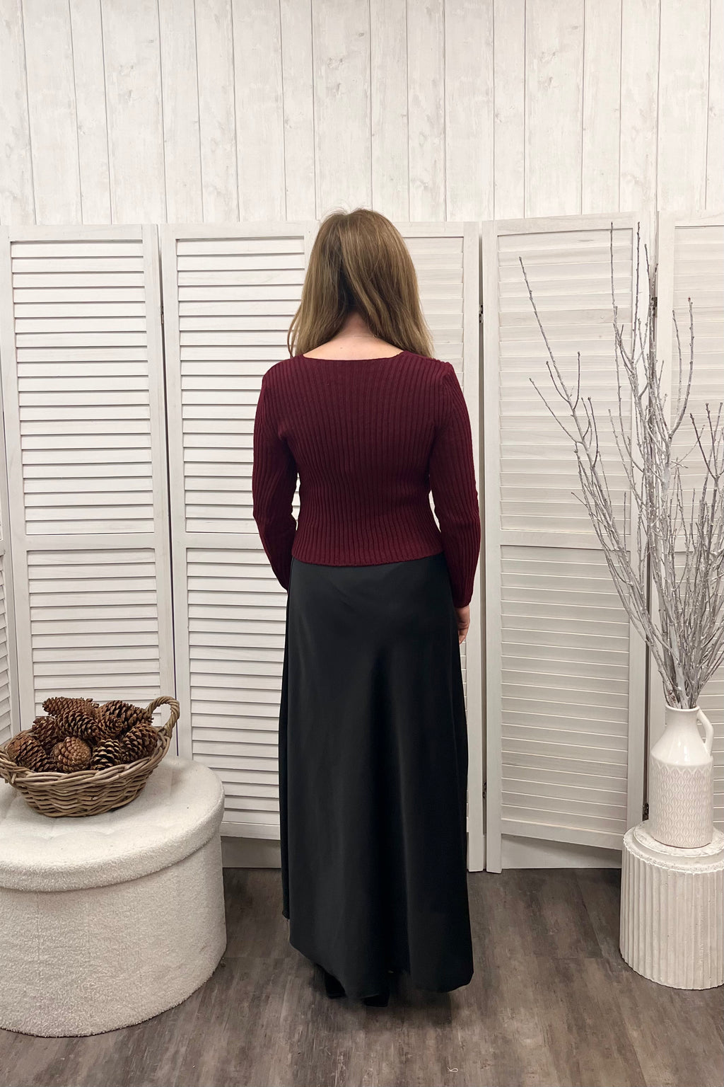 Ribbed knit perfection featuring a flattering v shape neckline, full length sleeves, and a straight hemline for a clean finish and a slightly cropped midi length that sits just above the waist. Perfect for pairing with high rise jeans or skirts. Made for a smaller frame, this piece combines snug, feminine fit with soft stretch knit fabric that moves with you.