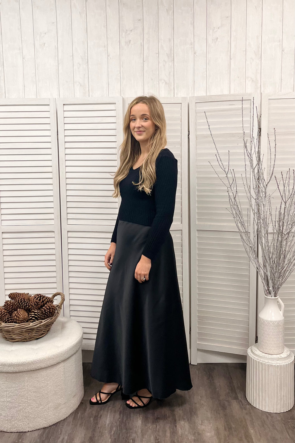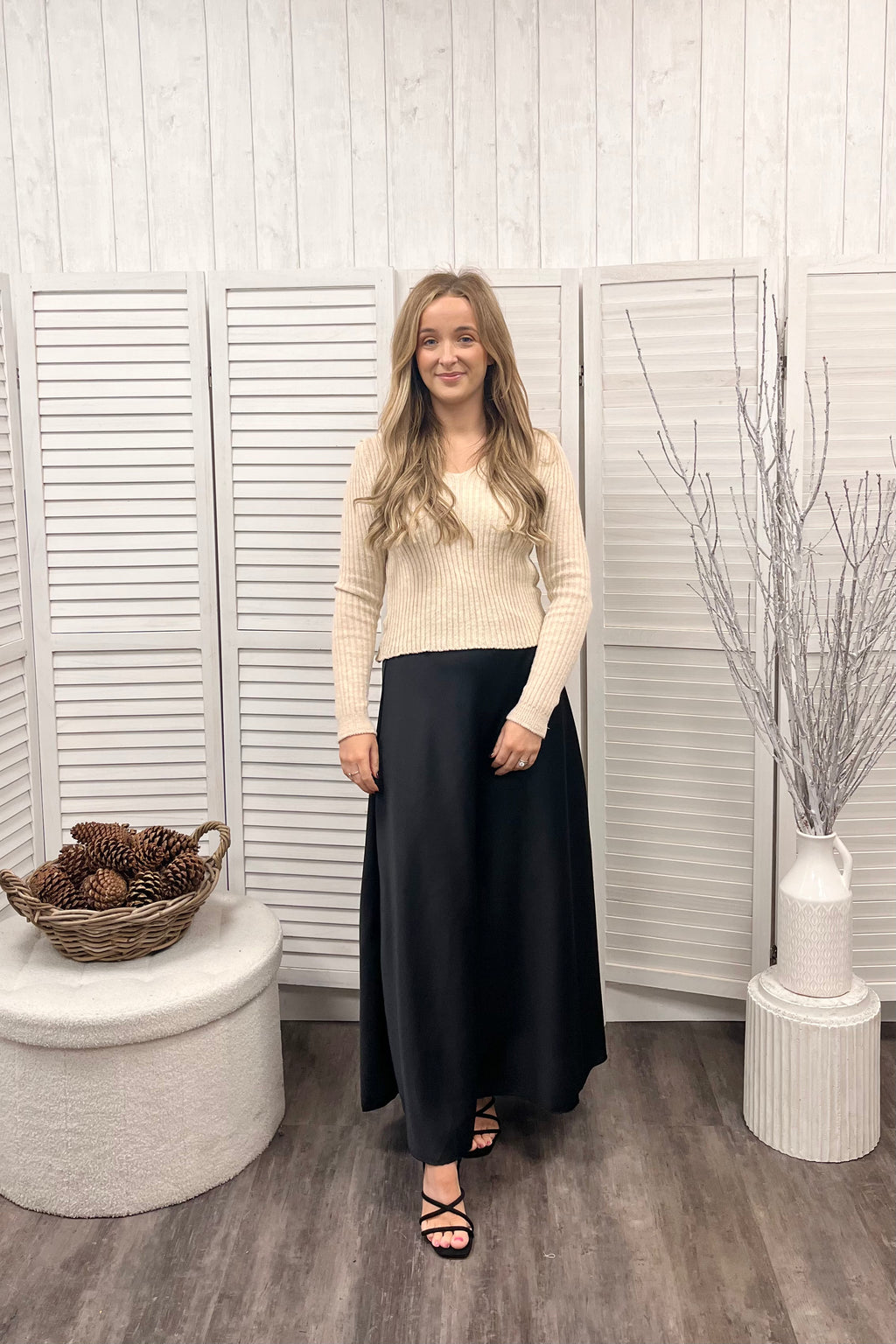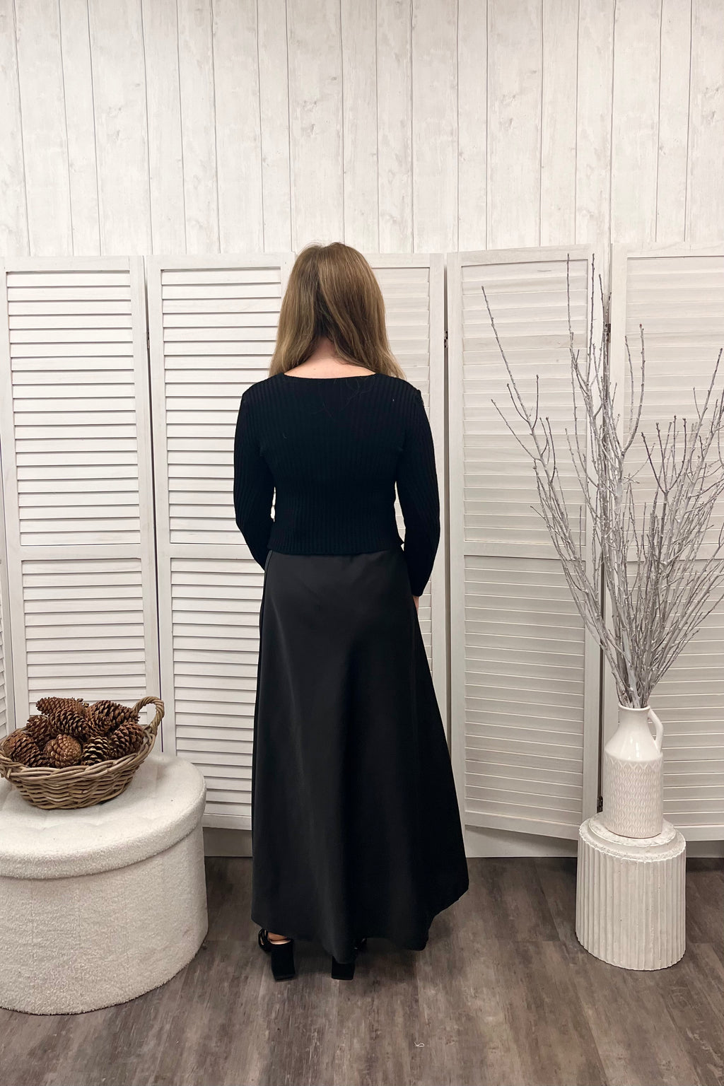 Ribbed knit perfection featuring a flattering v shape neckline, full length sleeves, and a straight hemline for a clean finish and a slightly cropped midi length that sits just above the waist. Perfect for pairing with high rise jeans or skirts. Made for a smaller frame, this piece combines snug, feminine fit with soft stretch knit fabric that moves with you.