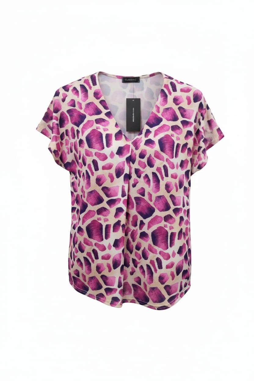 Make a statement with this eye-catching abstract giraffe print top designed to bring effortless style to your everyday wardrobe. Featuring a flattering V-shape neckline, relaxed short sleeves, and a slightly curved hemline. With subtle pleat detail to the front and bold tones, this piece offers a contemporary feel and is comfortable yet chic, will suit many occasions and super easy to style.