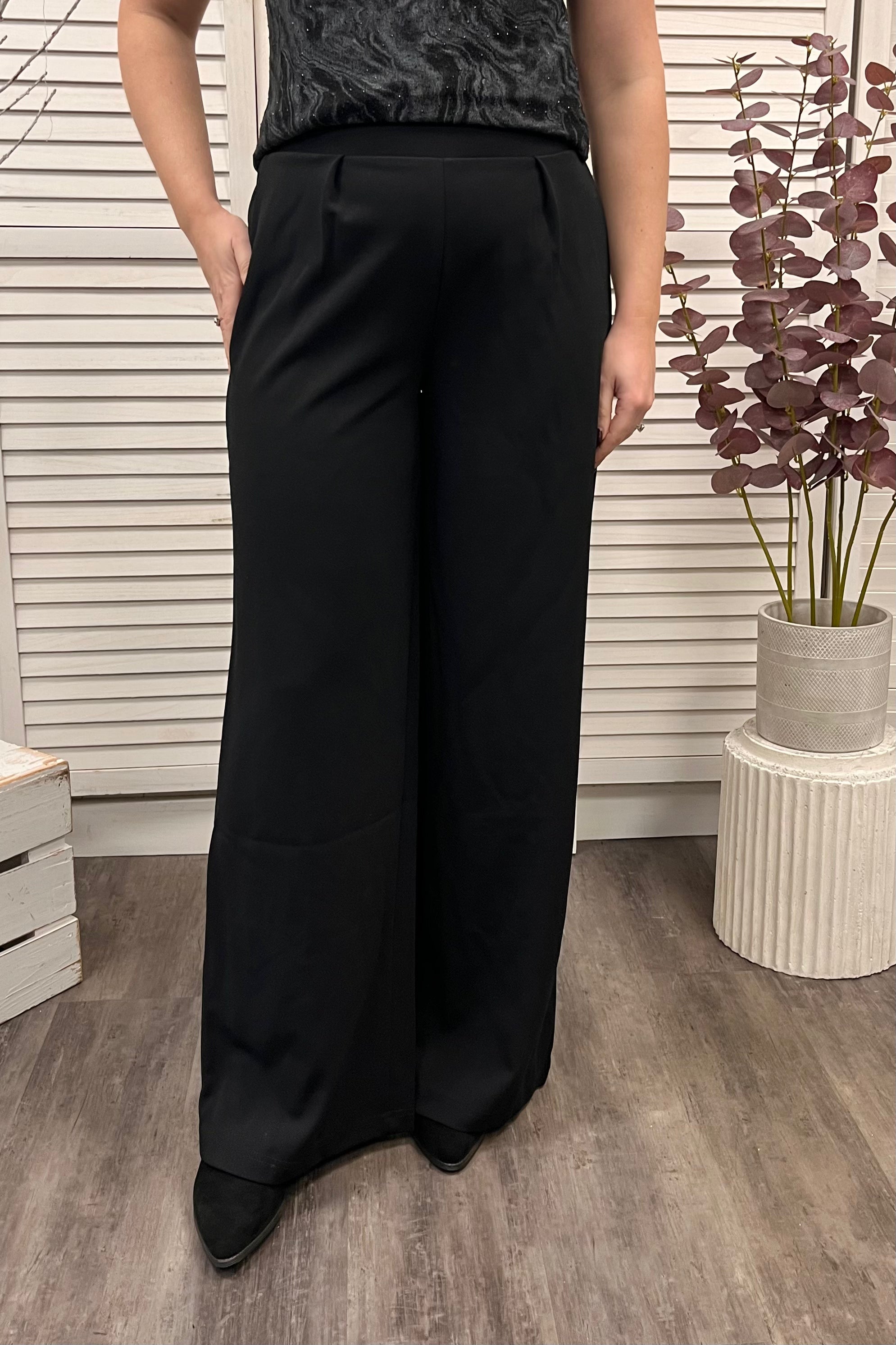 These wide leg pull on trousers are a staple style, the fabulous cut is comfortable, relaxed, and elegant all at the same time. They feature pleat detail to the front, and an elasticated waistband to the back. The georgette style fabric is perfect for the coming party season and will carry you through from day to night with ease.