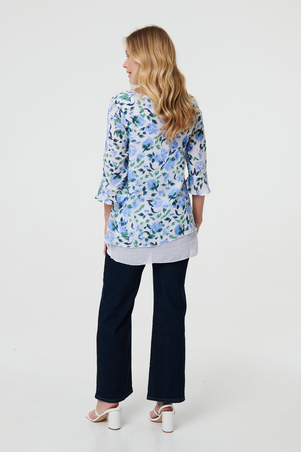 Beautiful floral leaf print double layer top featuring a round neck, fluted bracelet length sleeves, and a curved hi-lo hemline. The lightweight fabric and layering detail to the front creates a draping and floaty effect. The perfect addition to your wardrobe this coming season and super easy to style too.