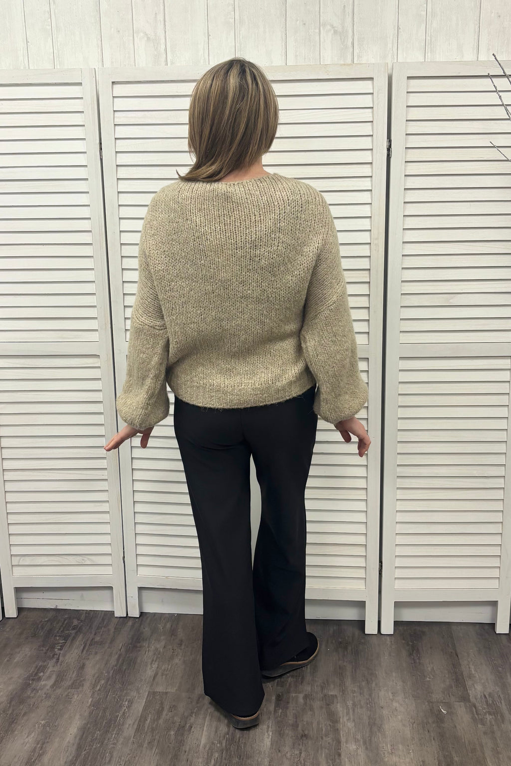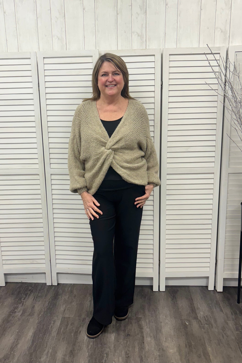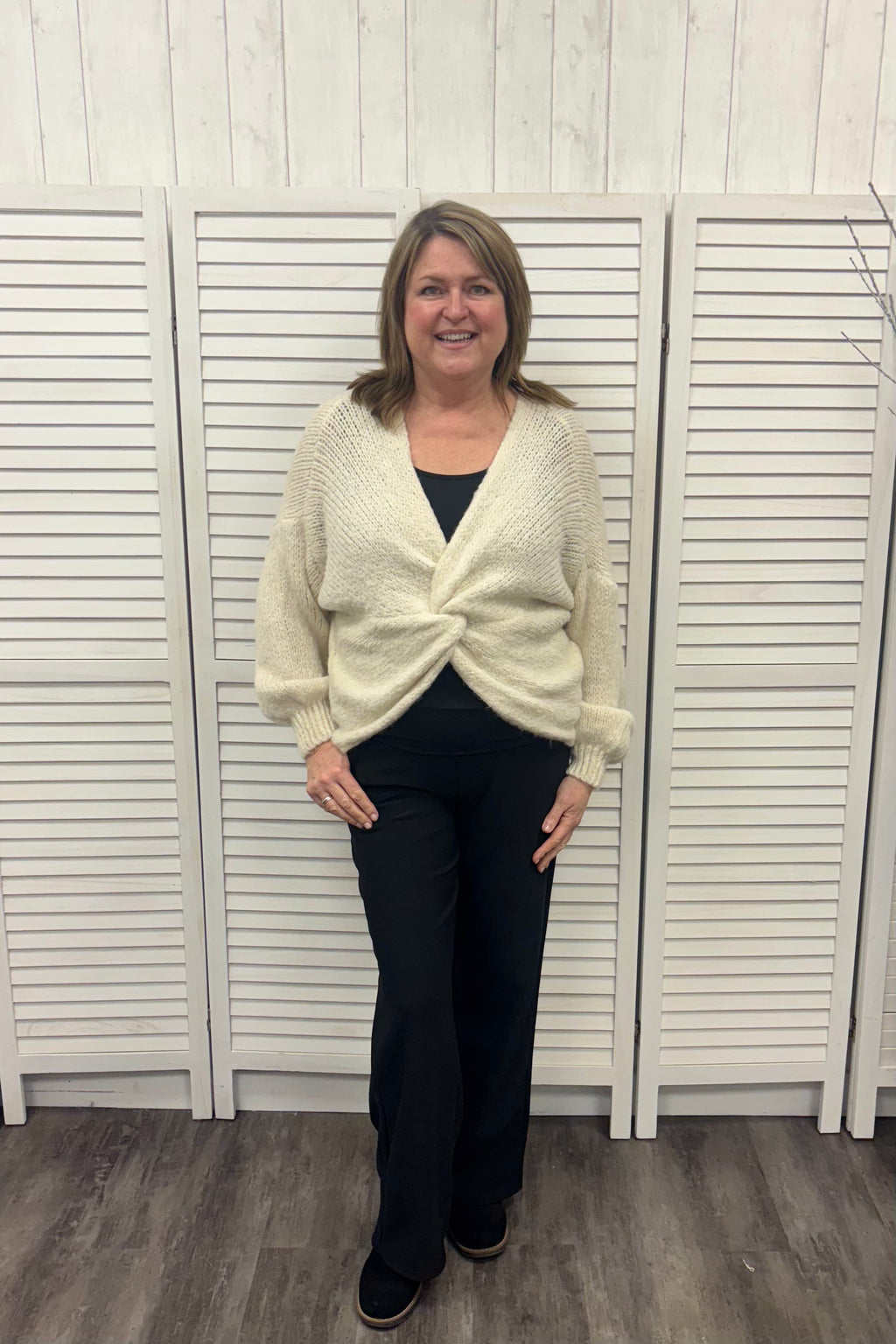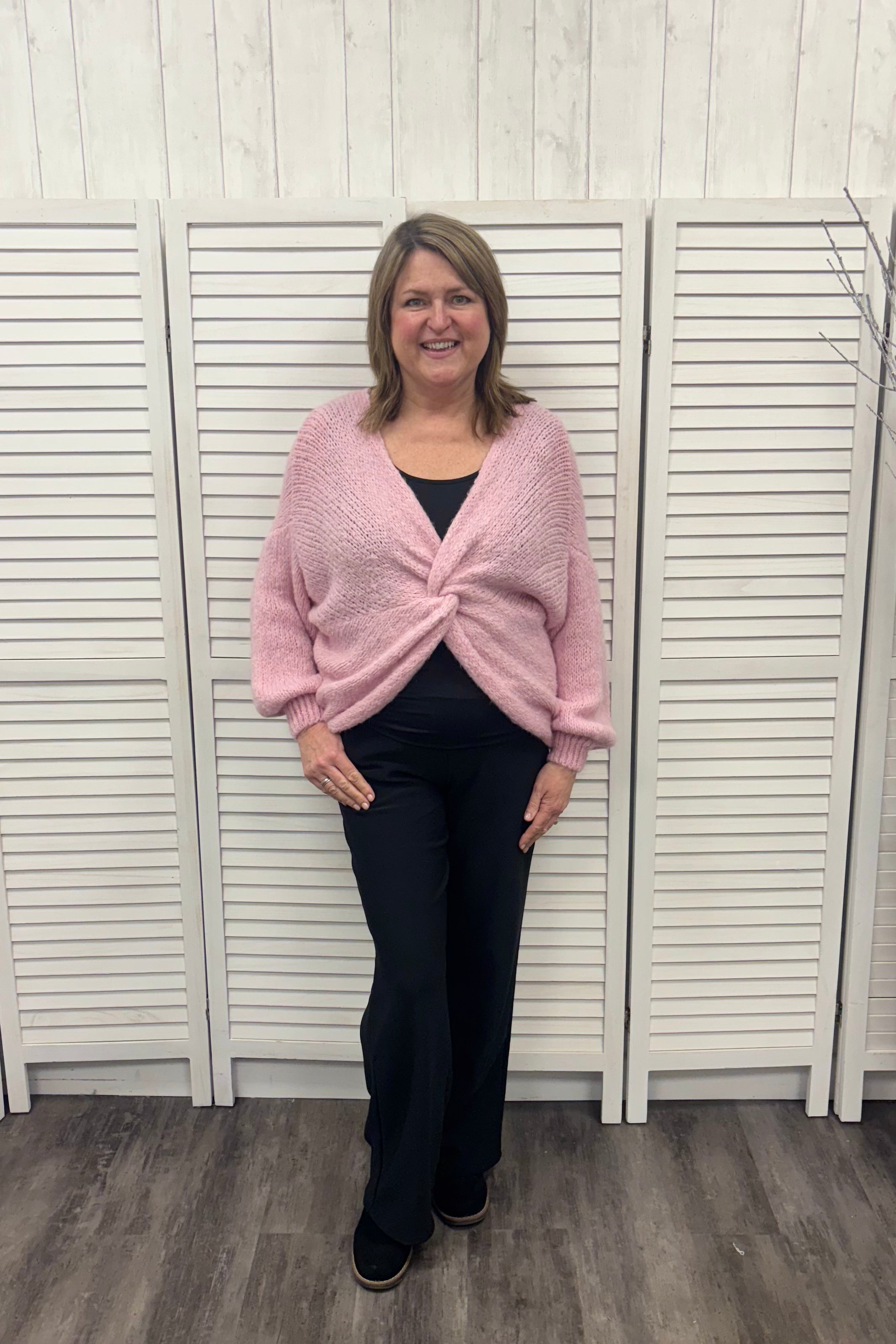 Elevate your everyday style with this beautiful soft knit. Designed to layer over various garments, it features a flattering V-shape neckline and full length cuffed sleeves. The lightweight, open weave texture gives it a cosy, yet breathable feel, making it perfect for layering all year round. The standout feature is the twist front, falling into a curved hemline. This adds a timeless, elegant touch for a soft, feminine silhouette.