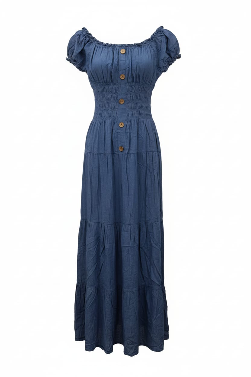 Feel fantastic in this classy, and incredibly comfortable soft denim look fabric maxi dress. Featuring an elasticated neckline, short elasticated sleeves, a shirred waistline with faux button detailing, concealed pockets, and a tiered skirt. The Bardot style allows you to wear it on or off the shoulder, which instantly and effortlessly adds a touch of glam.