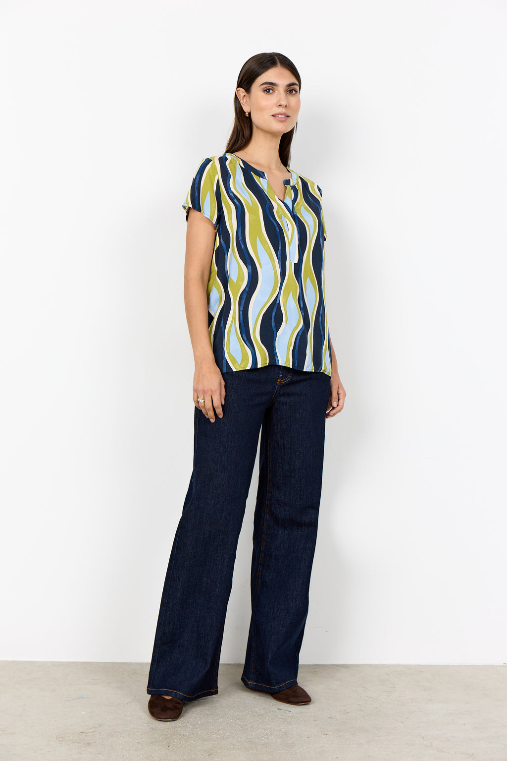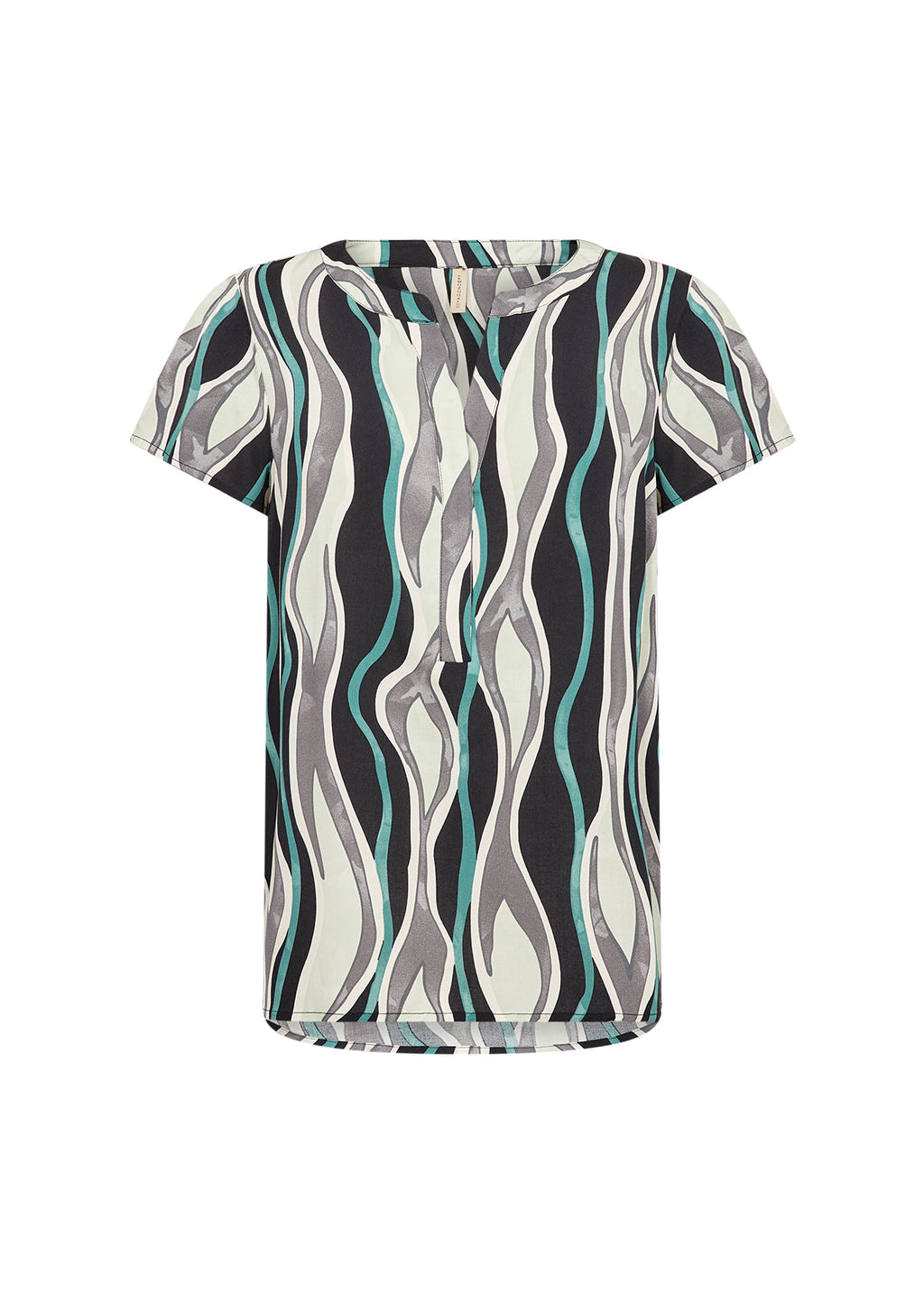 Bring a touch of class to your everyday style with this lightweight notch-neck abstract print top from SoyaConcept. With a relaxed design featuring short sleeves and a curved hemline. It drapes beautifully for all day comfort and pair with tailored trousers for a smart look, or dress it down with denim for casual outings.