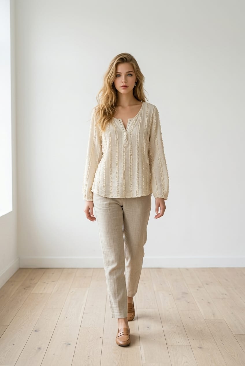 Effortlessly feminine and easy to wear, this beautifully textured ruffle detail top is a versatile addition to any wardrobe. Crafted from a lightweight, crinkled fabric, it offers a soft drape and a relaxed silhouette for all-day comfort. Designed with a flattering scoop neckline, it features a decorative button placket at the front for a subtle touch of detail, while the long sleeves and gently curved hem create a flowy, laid-back look. Also included is a matching vest liner in soft stretch fabric. Perfect for everyday wear, pairs effortlessly with jeans or tailored trousers, combining comfort with understated style.